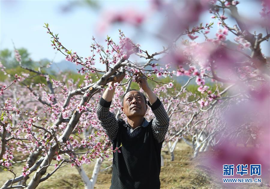 4月22日,河北省迁安市建昌营镇西三家村村民在果园内给桃树疏花。 近日,河北省迁安市的桃树、梨树和苹果树等果树相继开花。果农抢抓农时,进行疏花、授粉和松土等田间作业。 新华社记者 杨世尧 摄