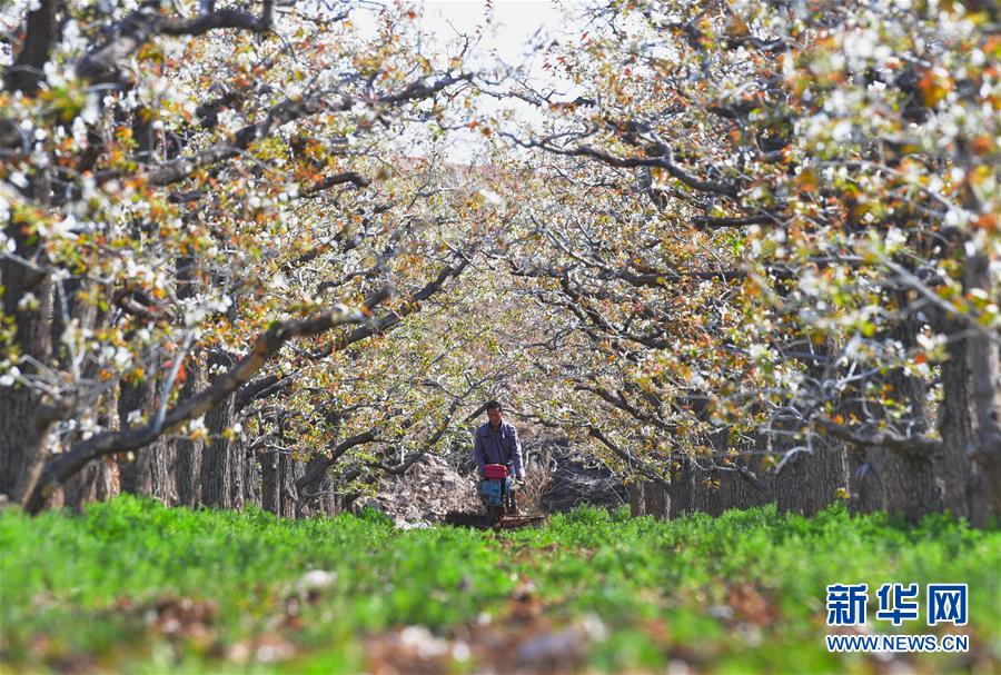 4月22日,河北省迁安市建昌营镇新房子村村民在果园内使用农机给梨树松土。 近日,河北省迁安市的桃树、梨树和苹果树等果树相继开花。果农抢抓农时,进行疏花、授粉和松土等田间作业。 新华社记者 杨世尧 摄