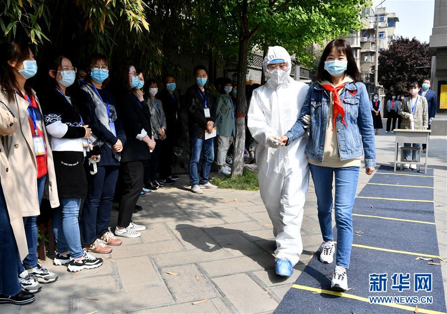 4月23日,西安新知小学的老师们在观摩体温异常应急处置演练。 当日,位于陕西西安新城区的西安新知小学开展返校开学防疫演练,模拟演练学生入校测温、体温异常应急处置、日常上课等环节,帮助学校工作人员熟练疫情防控流程,保障师生安全有序返校开学。据悉,西安各小学四至六年级将于4月27日开学复课。 新华社记者 刘潇 摄