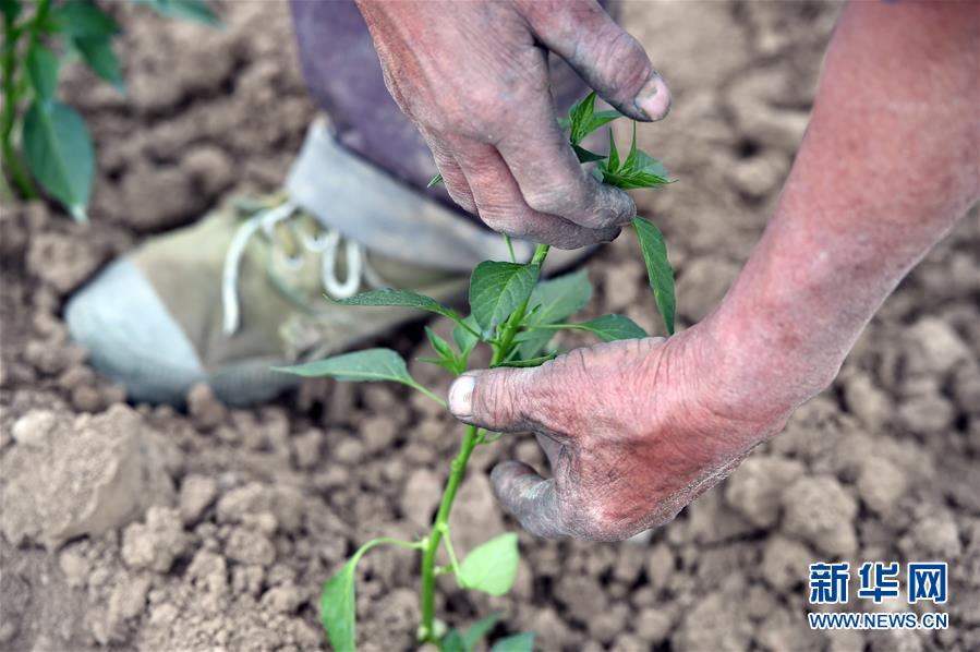 4月22日,在阜南县会龙镇闫庙村,董贺勤在辣椒大棚忙碌。新华社发(周牧摄)