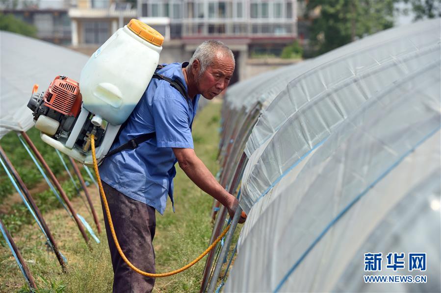 4月22日,在阜南县会龙镇闫庙村,董贺勤在辣椒大棚忙碌。新华社发(周牧摄)
