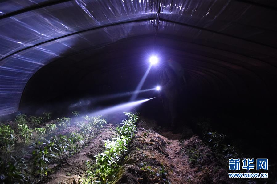 4月22日晚,在阜南县会龙镇闫庙村,董贺勤在辣椒大棚忙碌。新华社发(周牧摄)
