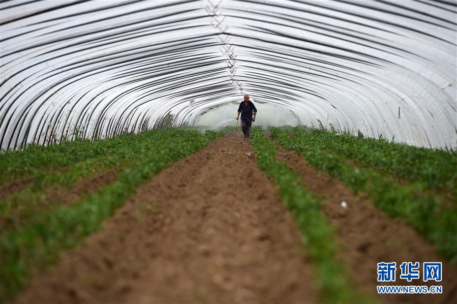 4月22日,在阜南县会龙镇闫庙村,董贺勤在辣椒大棚忙碌。新华社发(周牧摄)