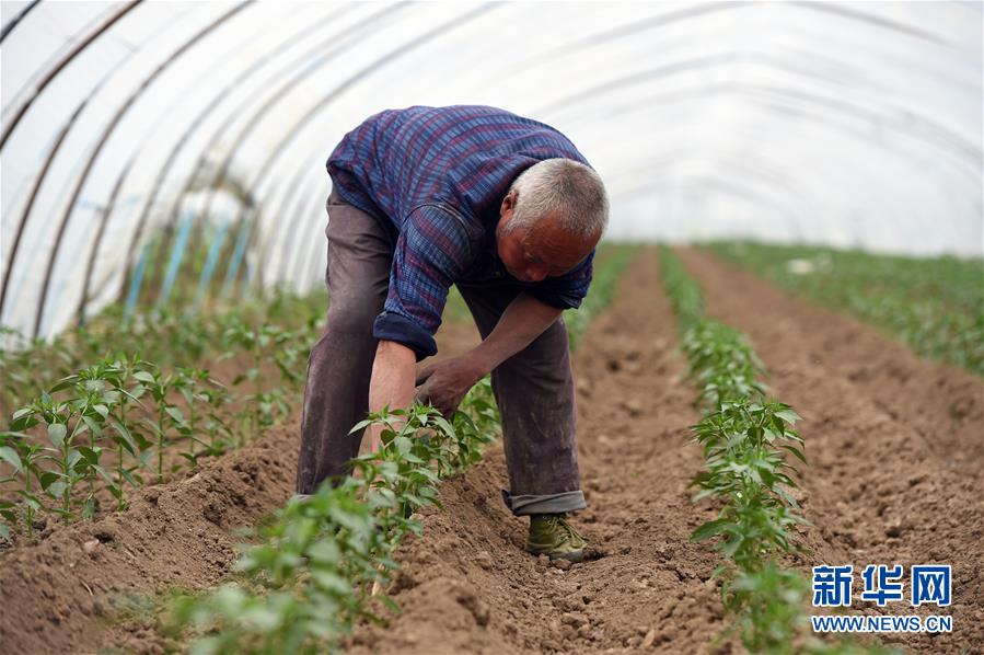 4月22日,在阜南县会龙镇闫庙村,董贺勤在辣椒大棚忙碌。新华社发(周牧摄)