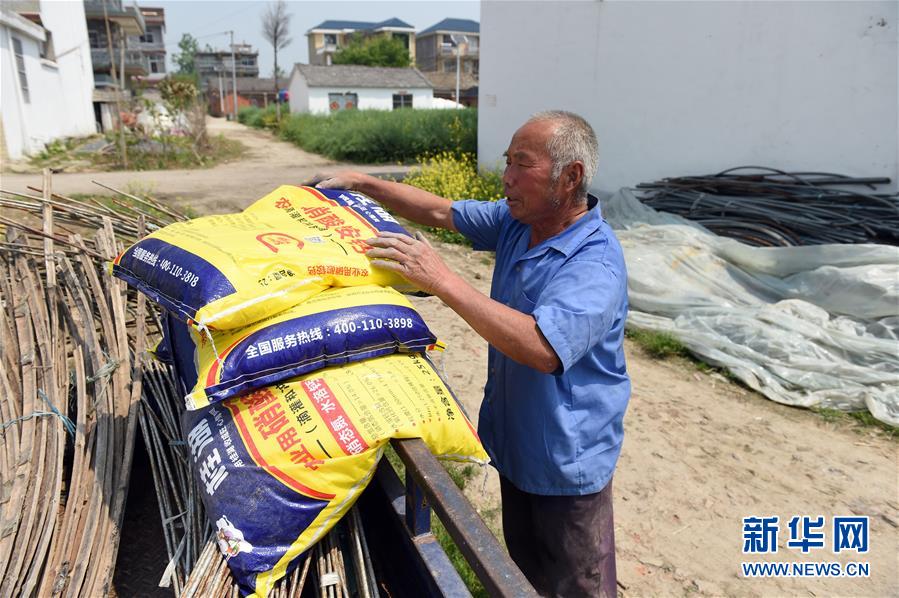 4月22日,在阜南县会龙镇闫庙村,董贺勤在准备化肥。新华社发(周牧摄)