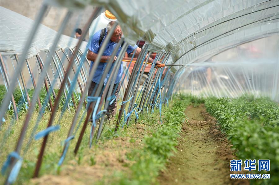 4月22日,在阜南县会龙镇闫庙村,董贺勤在辣椒大棚忙碌。新华社发(周牧摄)