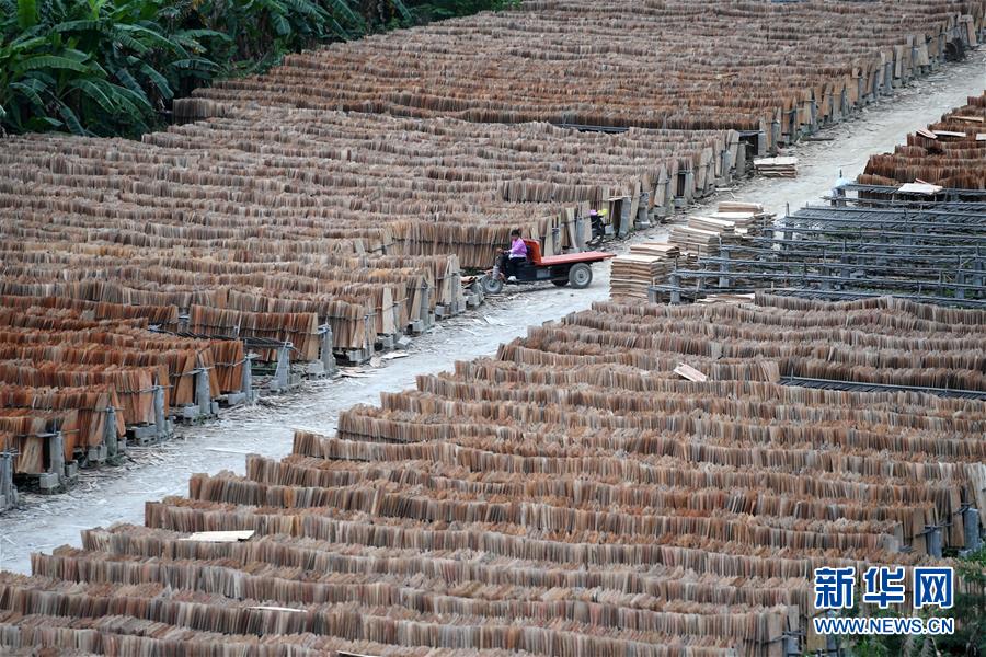 4月23日,广西隆林各族自治县者保乡一家木业企业的工人在收晾晒好的原材料。 新华社记者 陆波岸 摄