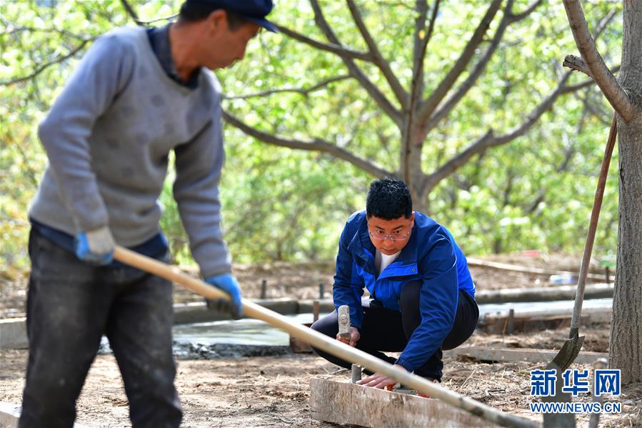 王磊(右)与合作社农户一起修建观光走廊(4月23日摄)。新华社记者 陈斌 摄