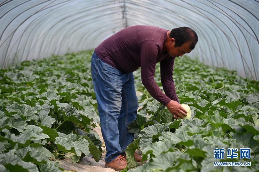 在郸城县秋渠乡任岭村的甜瓜大棚内,村民在查看甜瓜长势(4月23日摄)。新华社记者张浩然摄