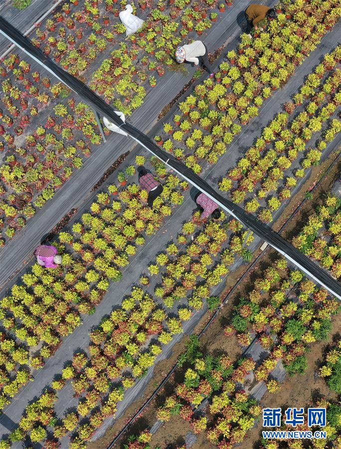 4月23日,安徽省蒙城县小辛集乡唐庄村农民在佩先林业种植专业合作社花木基地管理花木(无人机照片) 。 蒙城县佩先林业种植专业合作社通过流转农民土地建立了500余亩的花木基地,种植花木100余个品种,产品销往江浙沪以及河南和本省蚌埠、亳州等地市场。 新华社发(胡卫国 摄)