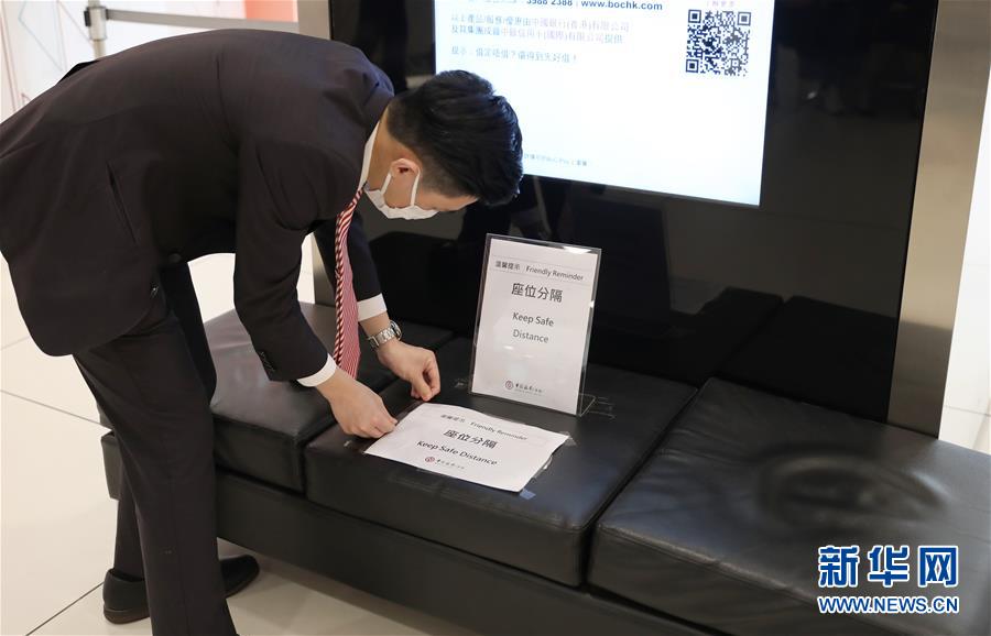 4月23日,在中银香港永安集团大厦分行,工作人员在整理顾客座位间隔提示牌。 新华社记者 吴晓初 摄