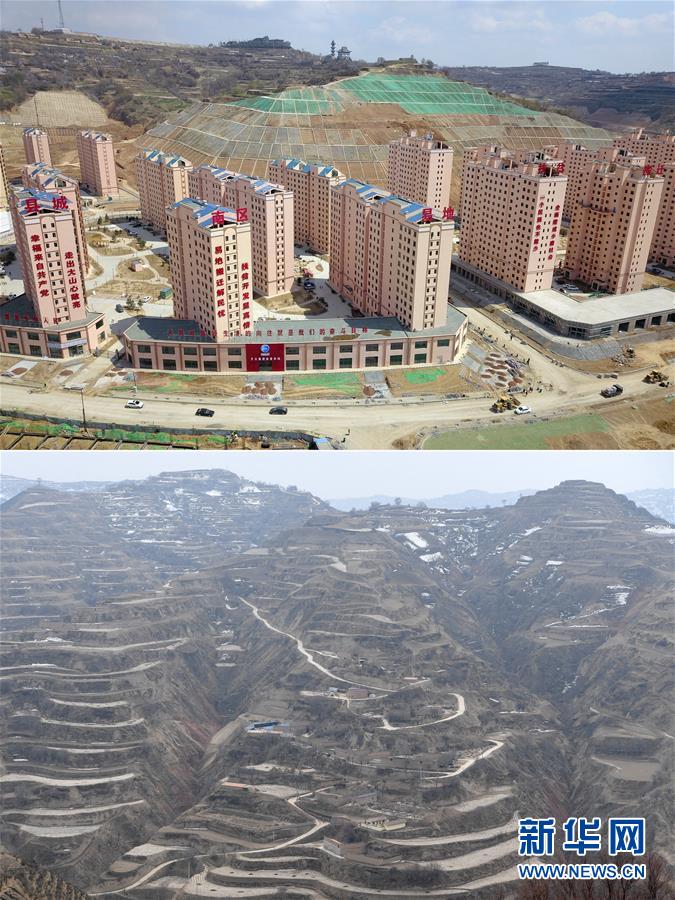 拼版照片:上图为4月24日在甘肃东乡族自治县拍摄的县城南区易地扶贫搬迁安置小区(无人机照片);下图为2019年3月5日在东乡族自治县龙泉镇拍摄的大山中的苏黑村。东乡族自治县县城南区易地扶贫搬迁安置小区共安置包括龙泉镇在内的22个乡镇易地扶贫搬迁群众9119人。新华社记者 范培珅 摄