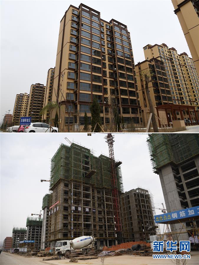 拼版照片:上图为4月20日在甘肃东乡族自治县达板镇拍摄的已入住的易地扶贫搬迁安置小区;下图为2019年3月4日在达板镇拍摄的建设中的易地扶贫搬迁安置小区。新华社记者 范培珅 摄