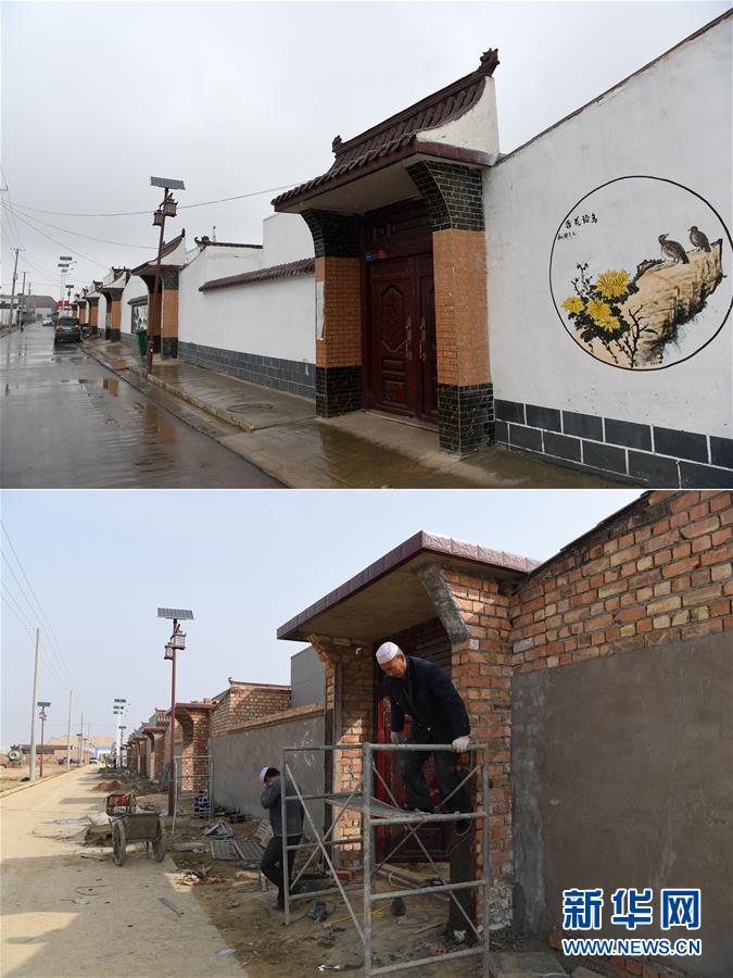 拼版照片:上图为4月21日在甘肃东乡族自治县龙泉镇拍摄的已入住的拱北湾村易地搬迁安置点;下图为2019年3月5日拍摄的建设中的拱北湾村易地搬迁安置点。新华社记者 范培珅 摄