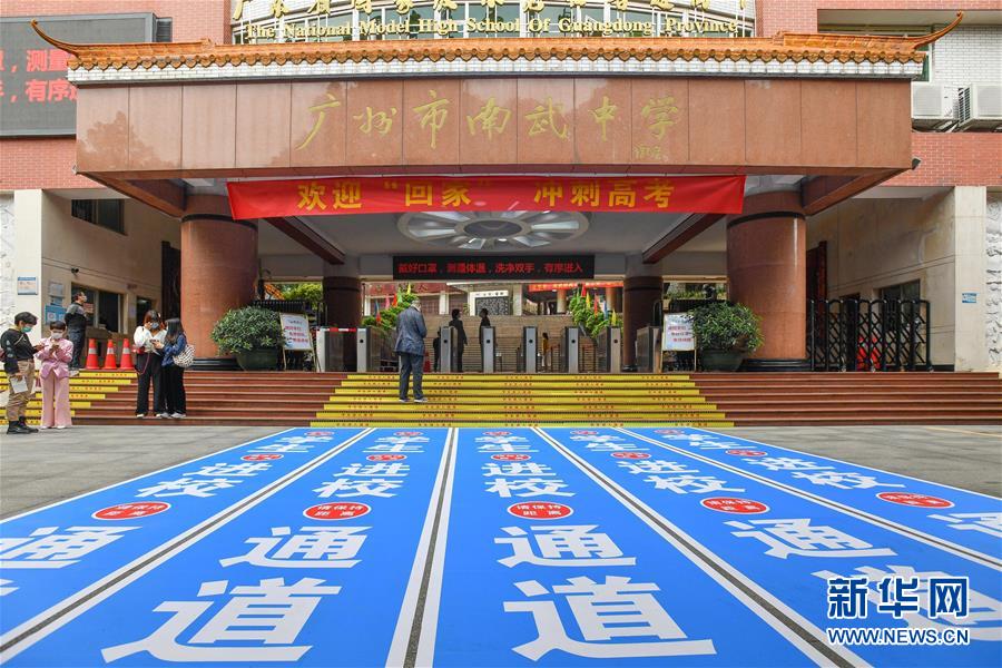 4月25日拍摄的广州市南武中学校园门口。 当日,广州市教育局邀请广州市南武中学的学生家长代表走进校园,实地体验学生即将返校学习生活的情况,了解学校各项疫情防控准备工作。 新华社记者 刘大伟 摄