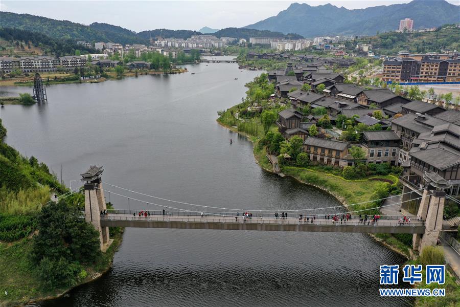 4月25日,游客在丹寨万达小镇游玩(无人机照片)。 当日,2020年贵州省促进旅游消费启动仪式在丹寨县的丹寨万达小镇举行。现场派发“百万旅游消费券”,供游客在丹寨万达小镇消费时使用,助力旅游业复苏。 新华社记者 欧东衢 摄