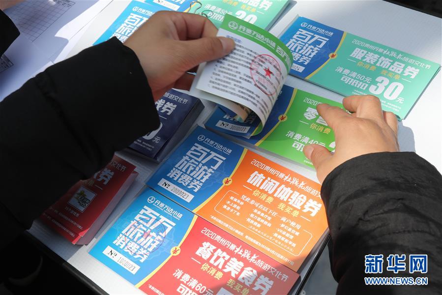 4月25日,工作人员在丹寨万达小镇发放旅游消费券。 当日,2020年贵州省促进旅游消费启动仪式在丹寨县的丹寨万达小镇举行。现场派发“百万旅游消费券”,供游客在丹寨万达小镇消费时使用,助力旅游业复苏。 新华社记者 欧东衢 摄
