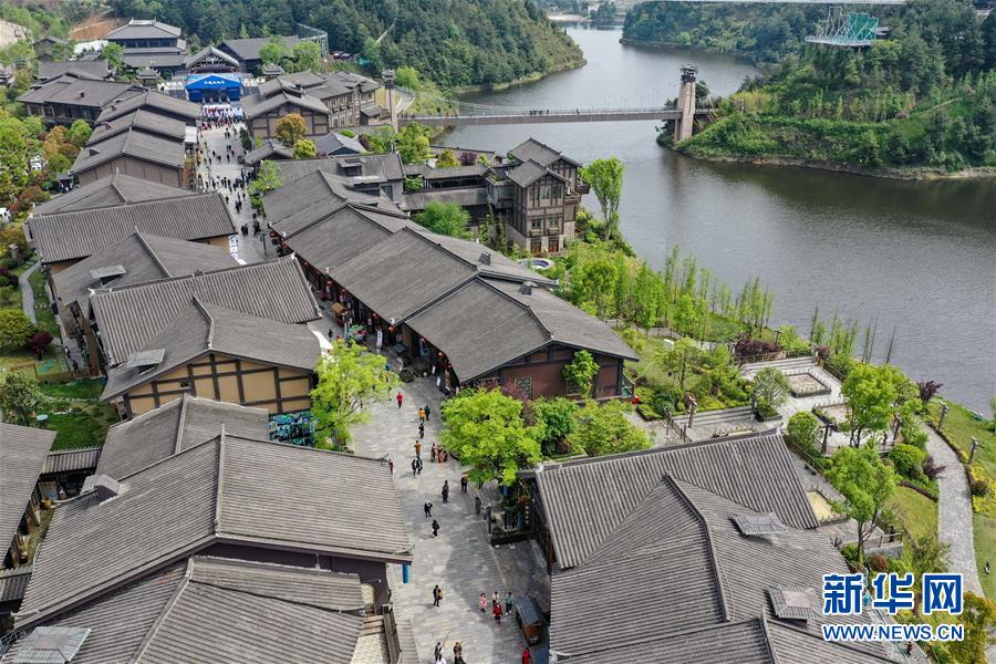 4月25日,游客在丹寨万达小镇游玩(无人机照片)。 当日,2020年贵州省促进旅游消费启动仪式在丹寨县的丹寨万达小镇举行。现场派发“百万旅游消费券”,供游客在丹寨万达小镇消费时使用,助力旅游业复苏。 新华社记者 欧东衢 摄