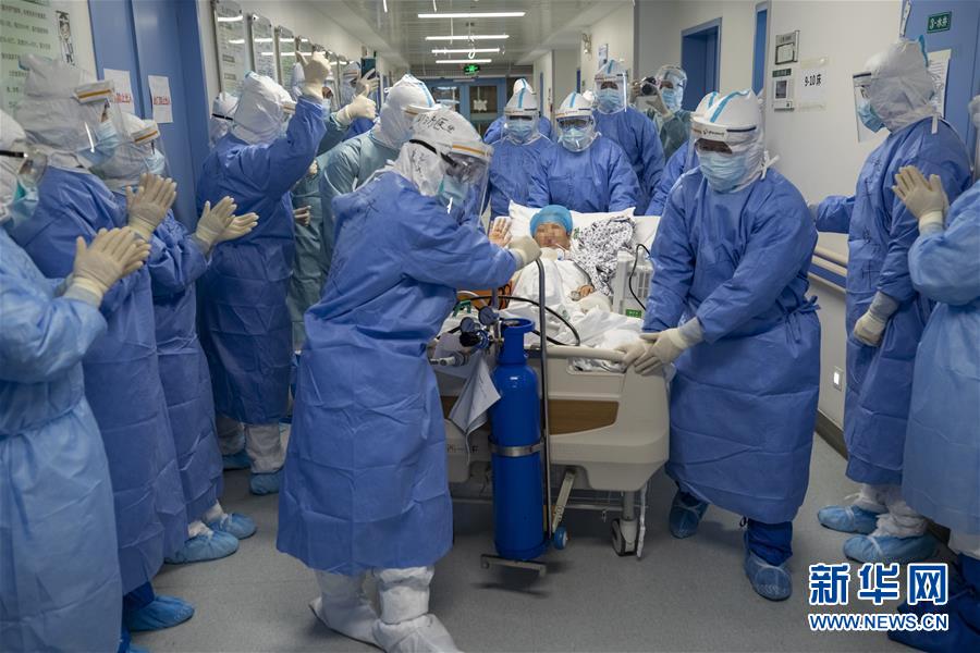 4月12日,北京协和医院医疗队队员与武汉同济医院医务人员共同将中法新城院区C9病区最后一名新冠肺炎危重症患者转往武汉同济医院中法新城院区ICU。这名患者是一名在疫情防控一线感染的武汉当地医务人员。 新华社记者 沈伯韩 摄