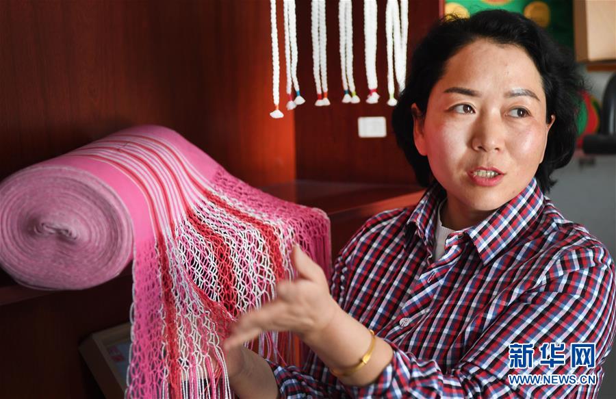 4月25日,马艳勤向上门的顾客介绍粗布编法。 家住陕西省渭南市合阳县的马艳勤,2014年回到乡下,在村上办起“古莘粗布制作中心”。3年后又组织当地60多名妇女,其中贫困户50人,成立“撂锣梭织土布专业合作社”,发展壮大传统的粗布产业,帮助乡亲们在家门口实现脱贫致富。 新华社记者陶明摄