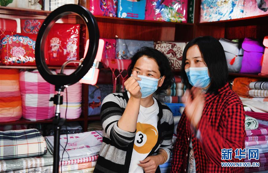 4月25日,马艳勤(左)在实体店直播推介合作社生产的粗布产品。 家住陕西省渭南市合阳县的马艳勤,2014年回到乡下,在村上办起“古莘粗布制作中心”。3年后又组织当地60多名妇女,其中贫困户50人,成立“撂锣梭织土布专业合作社”,发展壮大传统的粗布产业,帮助乡亲们在家门口实现脱贫致富。 新华社记者陶明摄