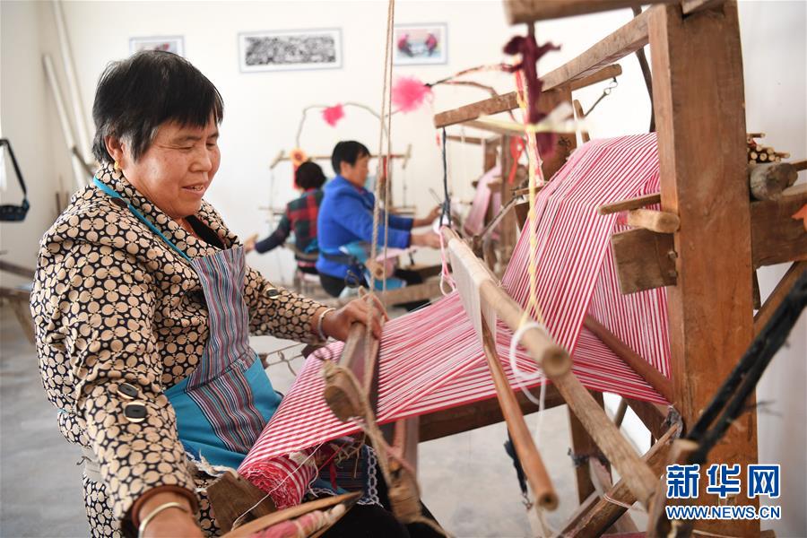 4月25日,合阳县黑池镇西中雷社区贫困户王玲娃在老式织布机上织布。 家住陕西省渭南市合阳县的马艳勤,2014年回到乡下,在村上办起“古莘粗布制作中心”。3年后又组织当地60多名妇女,其中贫困户50人,成立“撂锣梭织土布专业合作社”,发展壮大传统的粗布产业,帮助乡亲们在家门口实现脱贫致富。 新华社记者陶明摄