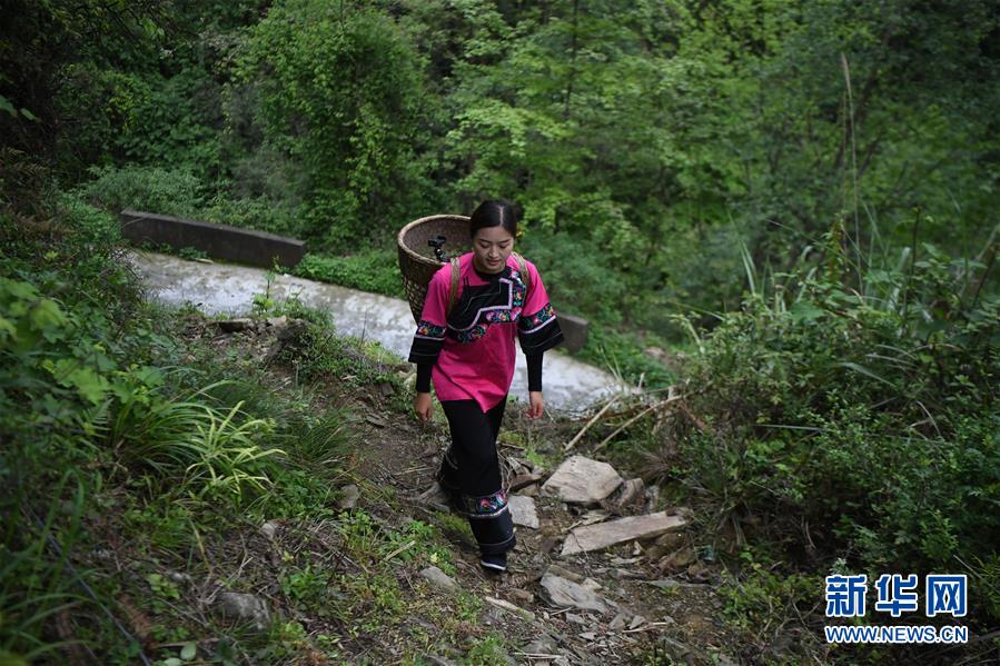 施林娇行走在十八洞村的山路上准备直播砍柴(4月23日摄)。 新华社记者薛宇舸摄