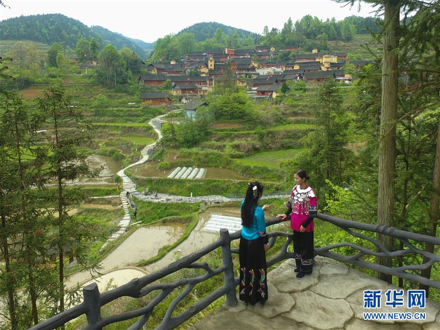 施林娇(右)在十八洞村和老师学习唱苗歌(4月23日摄,无人机照片)。 新华社记者薛宇舸摄