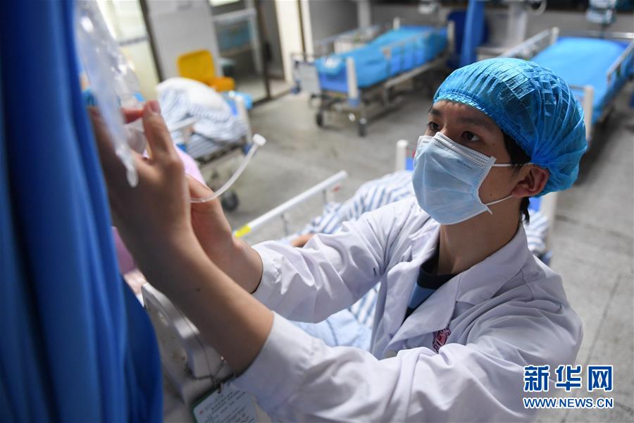 易俊丰在湖南省人民医院神内一科重症监护室为病人更换输液药品(4月22日摄)。 新华社记者 陈泽国 摄