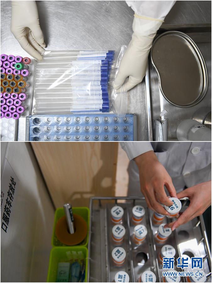 拼版照片:上图为2月7日,易俊丰在湖南省人民医院发热门诊整理工作台面;下图为4月22日,易俊丰在湖南省人民医院神内一科重症监护室整理口服药车。 新华社记者 陈泽国 摄