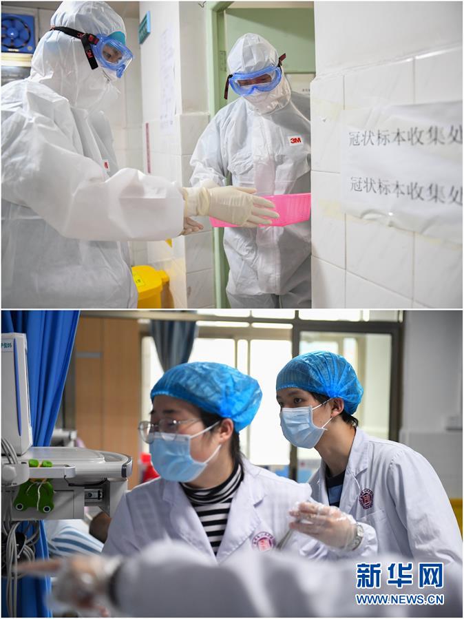 拼版照片:上图为2月7日,易俊丰(左)在湖南省人民医院发热门诊接诊区将咽拭子交给医生;下图为4月22日,易俊丰(右)在湖南省人民医院神内一科重症监护室与医生检查患者用药情况。 新华社记者 陈泽国 摄