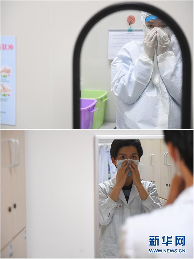 拼版照片:上图为2月6日,易俊丰在湖南省人民医院发热门诊更衣区佩戴口罩后检查气密性;下图为4月22日,易俊丰在湖南省人民医院神内一科更衣区佩戴口罩。 新华社记者 陈泽国 摄