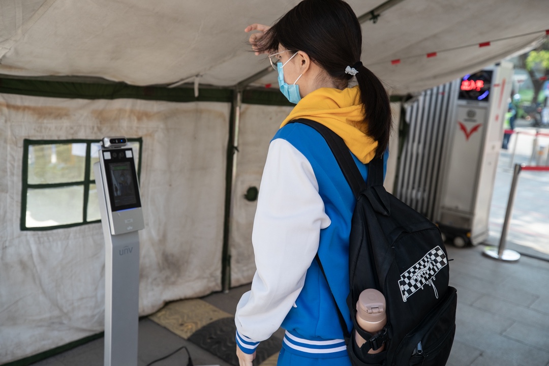 所有复课学校共储备了235.3万个应急口罩,27.3万升消毒液,258个测温门,6333个测温枪,25.4万副手套,4160套防护服,保证返校学生在疫情期间可以认真备考,安心学习。图为一名高三学生在经过电子测温仪。