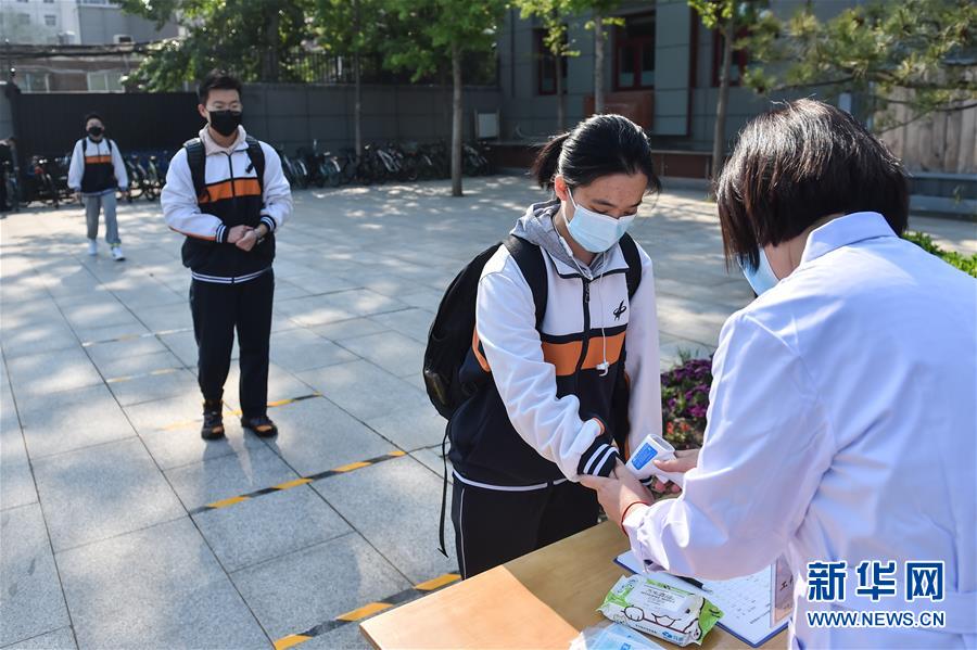 4月27日,北京一六一中学的学生排队测量体温。 当日,北京市高三年级学生开学复课。 新华社记者 彭子洋 摄