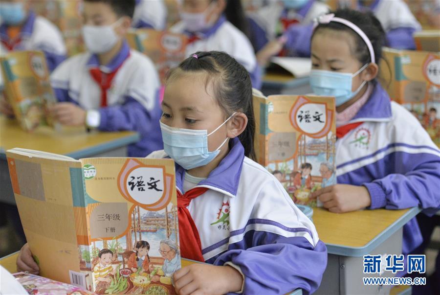 4月27日,在甘肃省临夏回族自治州永靖县移民小学,三年级学生在教室里上课。 当日,甘肃省临夏回族自治州小学一至三年级统一开学,至此该州中小学学生已全面开学复课。 新华社发(史有东 摄)