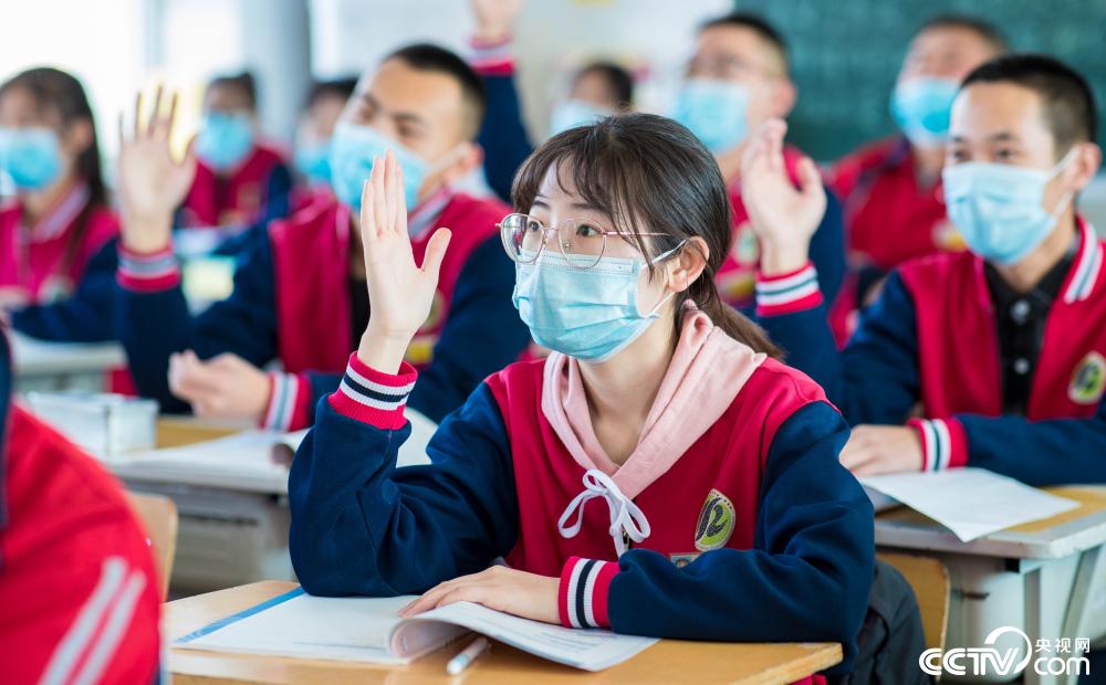 央视网消息:4月26日,内蒙古呼和浩特市第十二中学学生举手回答老师提问。设置测温消毒通道、实行错峰分餐制、增设临时隔点……4月26日,内蒙古呼和浩特市玉泉区教育局多措并举织密疫情防控安全网的前提下,高一、高二年级,初一、初二年级有序返校复学。这是该区第二批次学校开学,高三、初三年级已于3月30日复课。(丁根厚 摄影报道)