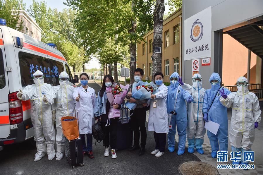 4月28日,小汤山医院最后一批新冠肺炎治愈患者(左四、左五)出院前和医护人员合影。 当日上午,北京小汤山医院最后一批新冠肺炎治愈患者出院。 新华社记者彭子洋摄