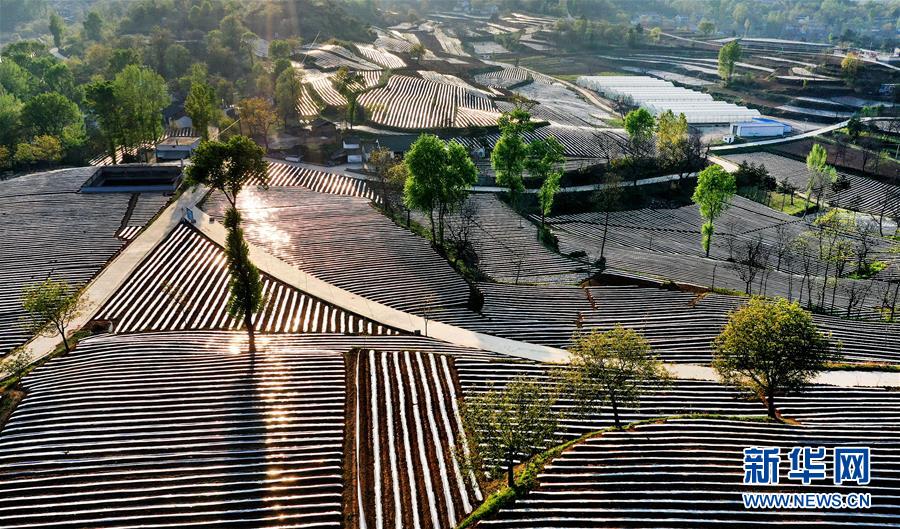 这是4月27日在洛南县石门镇拍摄的地膜田园风光(无人机照片)。 日前,在秦岭深处的陕西省商洛市洛南县的多个乡镇,当地群众用可降解塑料薄膜覆盖种植辣椒、烤烟等作物,呈现出一道道美丽的地膜田园风光。 新华社记者陶明摄