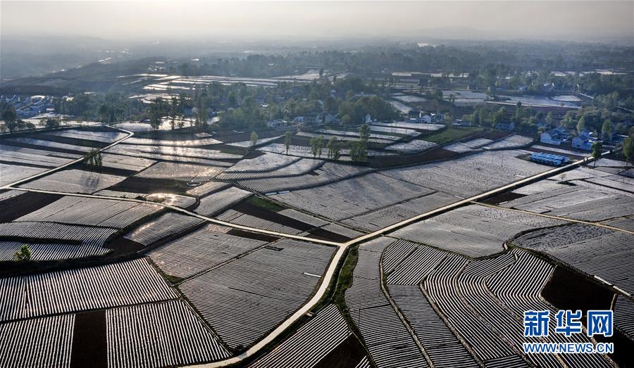 这是4月27日在洛南县永丰镇拍摄的地膜田园风光(无人机照片)。 日前,在秦岭深处的陕西省商洛市洛南县的多个乡镇,当地群众用可降解塑料薄膜覆盖种植辣椒、烤烟等作物,呈现出一道道美丽的地膜田园风光。 新华社记者陶明摄