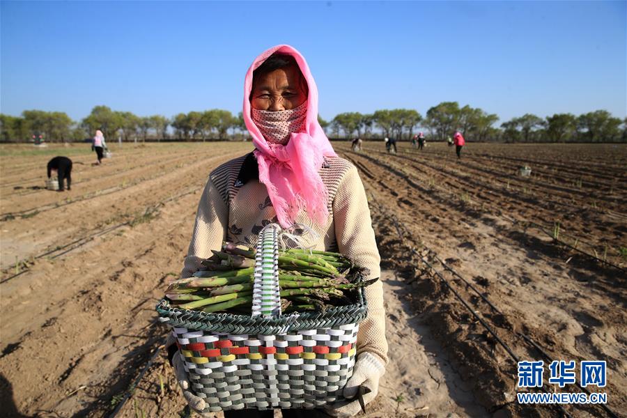 4月27日,同心县下马关镇窖坑子村村民在展示使用自动化滴水灌溉种植的芦笋。 近年来,宁夏回族自治区吴忠市同心县通过建设智慧水务中心、普及一体化测控智能闸门、饮水入户等措施,保障当地群众生活和种植业、养殖业用水,助力当地群众脱贫致富。据了解,今年在保证全县饮水安全和种植业、养殖业用水充足的前提下,同心县将严格控制用水总量,实施结构节水。 新华社记者 贾浩成 摄