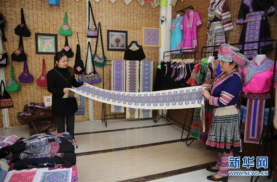 4月28日,屏边鑫园缘民族产品专业合作社的“绣娘”(右)在介绍产品。 近年来,云南省屏边苗族自治县以合作社模式设立巾帼脱贫小车间,开发苗族挂画和绣品等文创产品,为留守妇女提供在家门口就业机会。2019年,该县苗绣扶贫车间累计发展“绣娘”近300人,每人每月收入4000元左右。 新华社发(梁志强 摄)