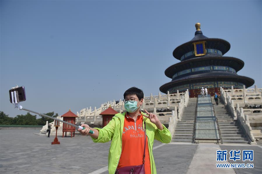 4月29日,一名游客在天坛公园祈年殿院落里自拍。 因疫情原因临时关闭的北京天坛公园祈年殿院落、皇穹宇院落、圜丘3处景点自4月29日起恢复开放接待游客(院内大殿、配殿等室内空间继续保持关闭状态)。为在当前疫情防控形势下加强游览秩序管控,给游客提供安全、健康、舒适的游览环境,重新开放后的3处景点将实施实名预约购票和限流管控措施,现场不售票。 新华社记者 彭子洋 摄