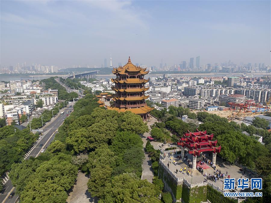 4月29日拍摄的武汉黄鹤楼景区(无人机照片)。 当日,武汉黄鹤楼景区重新开放。目前,景区不提供窗口售票,游客通过网络实名预约购票。黄鹤楼主楼部分开放,每半小时允许300名游客进入。 新华社记者 熊琦 摄