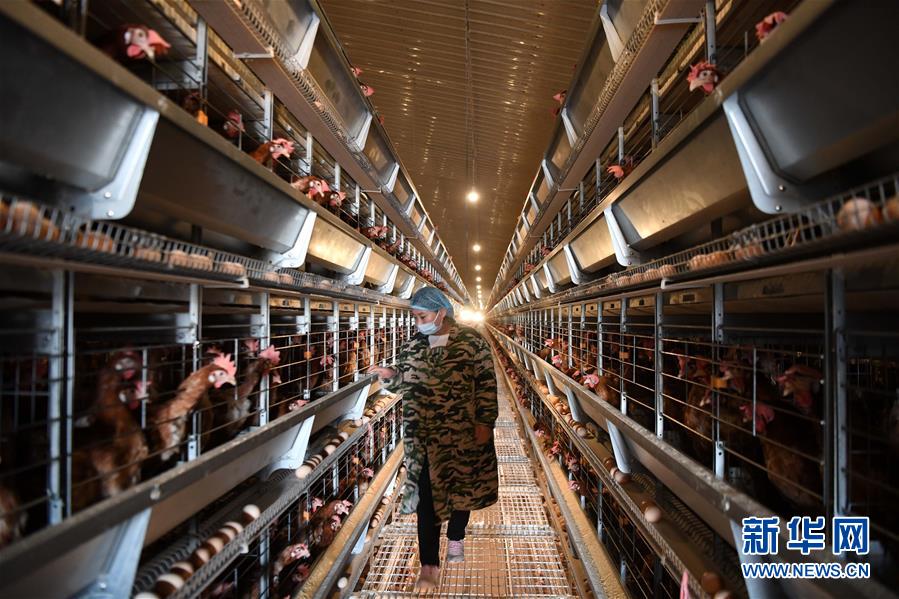 4月28日,农民在河南省汝阳县刘店镇一家规模养鸡场工作,该基地共带动532家贫困户脱贫。 新华社记者 朱祥 摄