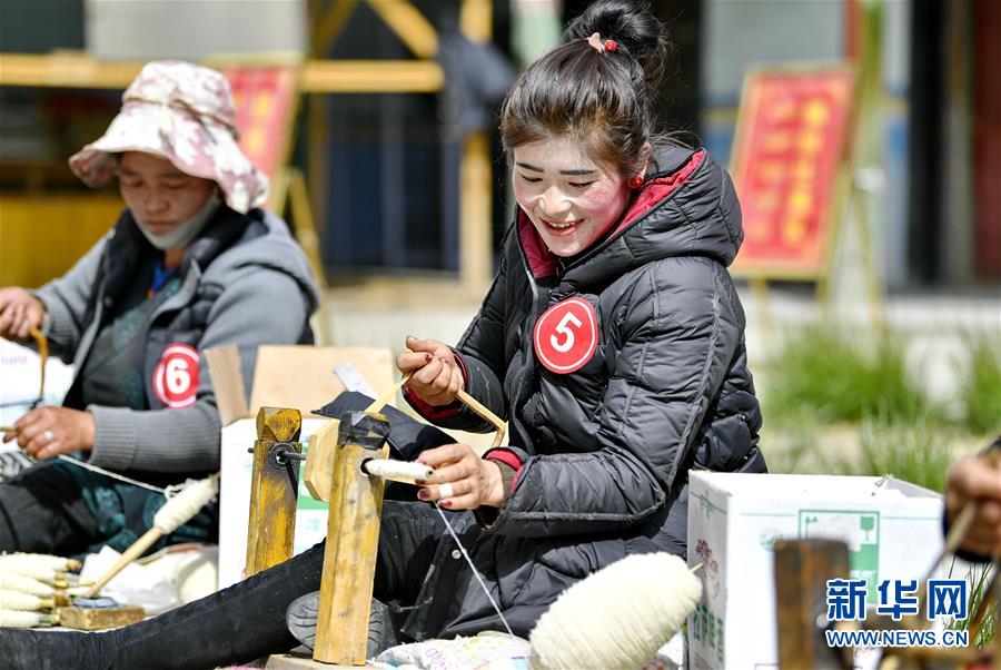 4月28日,选手在贡嘎县劳动技能大赛上参加卷毛线比赛。新华社记者 张汝锋 摄