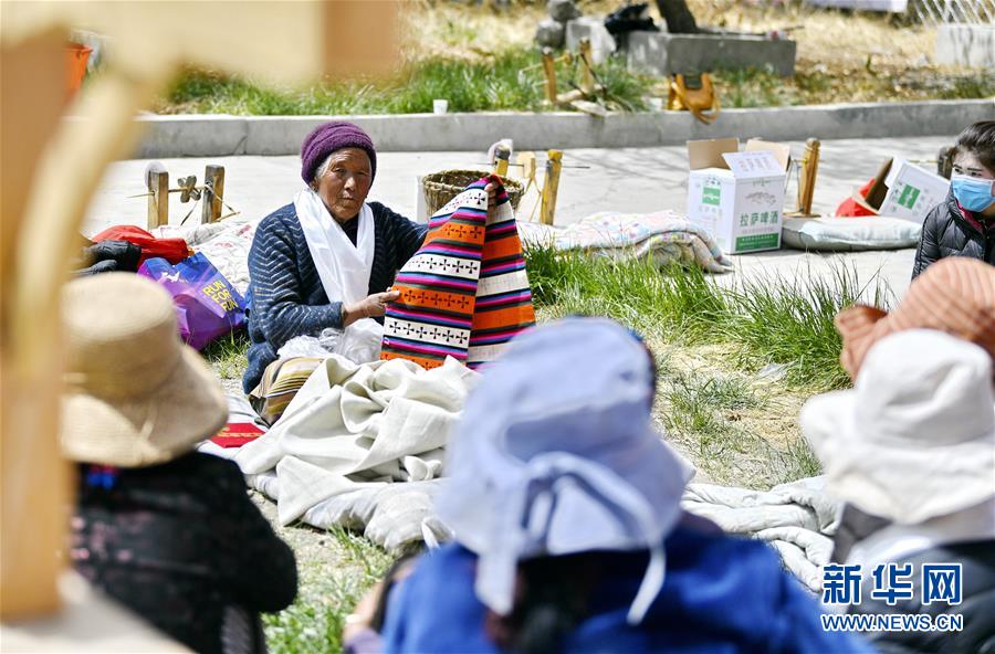4月28日,贡嘎县劳动技能大赛结束后,70岁的选手达瓦拉吉和大家分享“邦典”制作技艺。新华社记者 张汝锋 摄