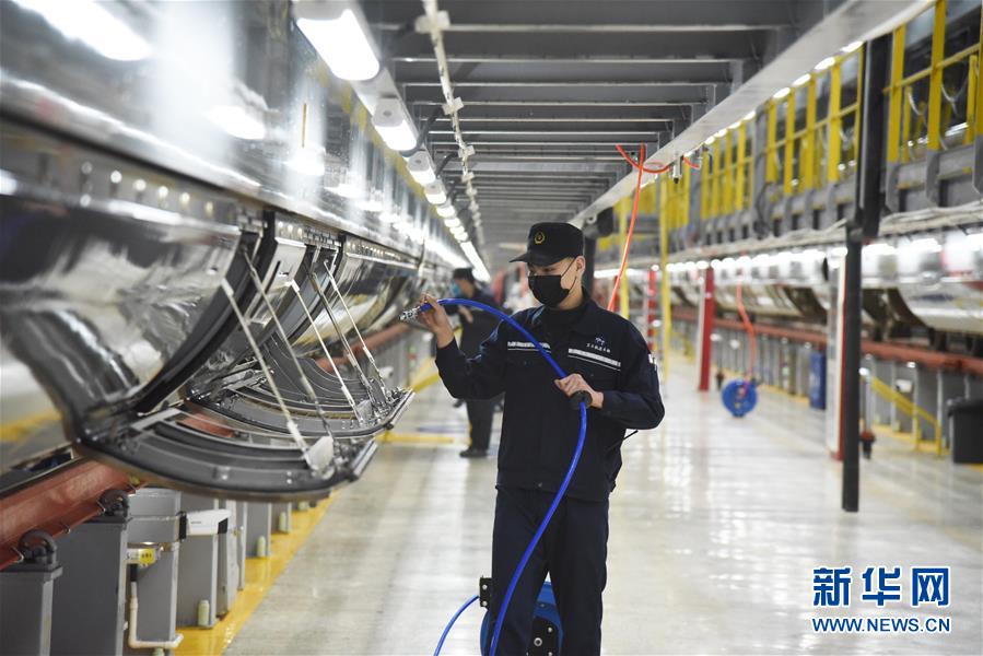 4月21日,中国铁路济南局集团公司青岛动车段临沂北动车所的工作人员在检查日兰高铁列车。新华社记者 王凯 摄
