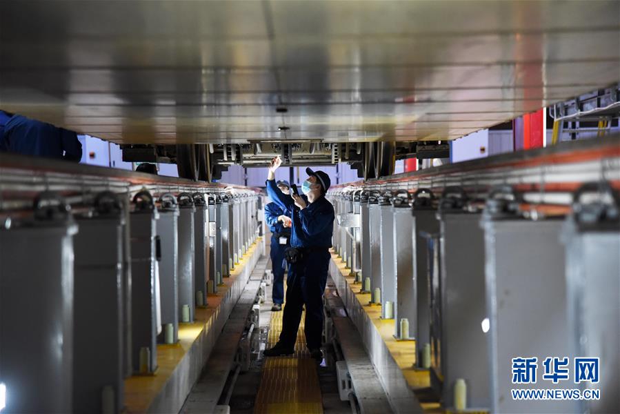 4月21日,中国铁路济南局集团公司青岛动车段临沂北动车所的工作人员在检查日兰高铁列车。新华社记者 王凯 摄