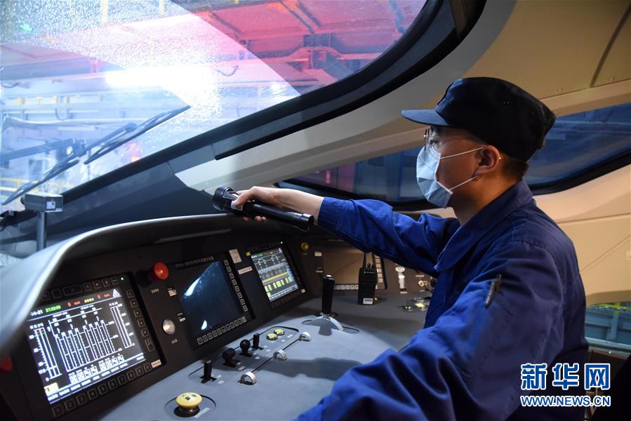 4月21日,中国铁路济南局集团公司青岛动车段临沂北动车所的工作人员张祥在检查日兰高铁列车。新华社记者 王凯 摄