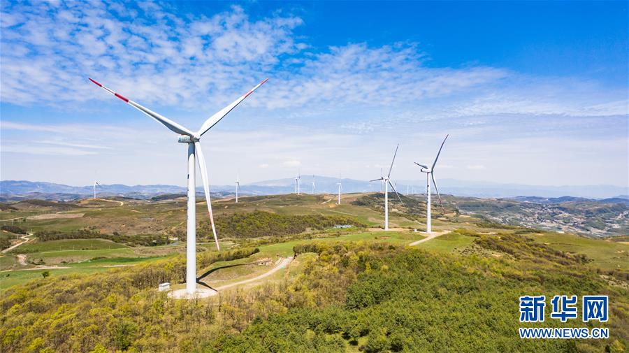 威宁彝族回族苗族自治县雪山镇的风力发电设备(4月27日摄,无人机照片)。新华社记者 陶亮 摄